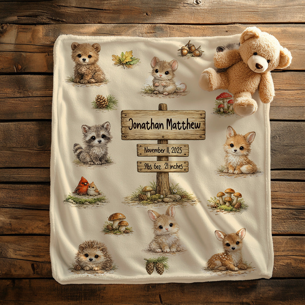 Wrap your little one in a forest of love! Our Custom Woodland Birth Stats blanket isn't just a cozy layer; it's a personalized piece of art. Featuring charming illustrations of a bear, fox, deer, and more, this blanket captures those precious "day one" details in a design that fits perfectly with modern or rustic nursery decor. It’s the ultimate baby shower gift that parents will cherish for years. There is also just a name option with a single sign on the post. Your choice.